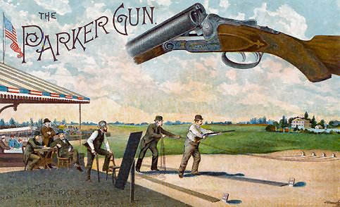 This early Parker trade card, circa 1893, is a great interpretation of an early pigeon shoot. Note the Parker plunge traps and the long cords to the puller. According to Ed Muderlak, author of Parker Guns, the Old Reliable, the card shows us a lot more. The shooter is Parker super salesman A. W. Du Bray. The man poised and ready to pull one of the cords attached to the trap is another Parker salesman, S. A. Tucker. Man in the brown coat under the tent with his hands folded is C. W. Budd, a Parker shooting pro. Pigeon shooting in the 1890s was a national sport attracting huge crowds, national publicity and large jackpots for the winners and the gamblers. It certainly rivaled major league baseball.