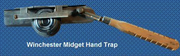 The sturdy midget size Winchester-made Hand Trap is strongly constructed and simple tooperate. One person can both throw and shoot if he desires. This new hand trap is also made in standard size for those who shoot larger shotguns at standard size targets. The clay targets or "pigeons" are exact reproductions of the standard trapshooting targets except for size. There are 100 in each outfit and additional targets can be obtained at any time from any Winchester dealer.