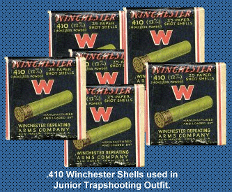 The .410 Winchester loaded shells are carefully made and give a good, uniform pattern. They are filled with No. 8 shot. Six boxes, 25 to the box, are supplied with each outfit.